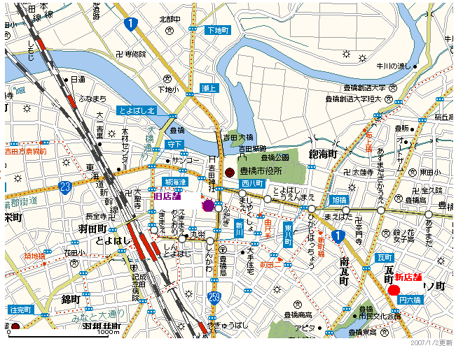 国道1号線を豊橋市役所から東へ行き、円六橋交差点(信号あり)を左に曲がりすぐ左側